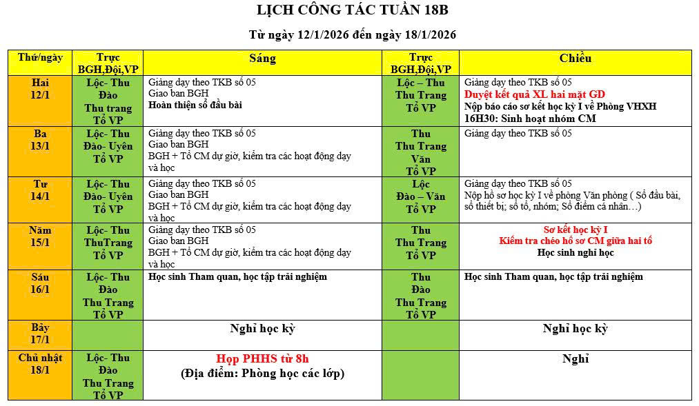 Lịch công tác Tuần 18B (từ ngày 12/01/2026 đến 18/01/2026)