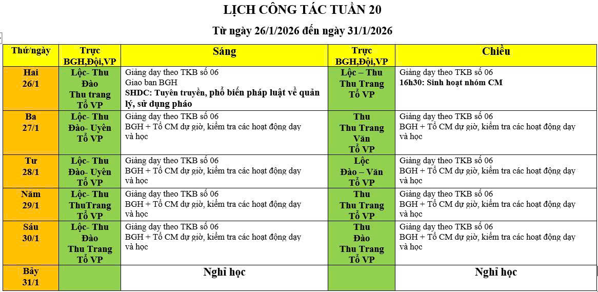 Lịch công tác Tuần 20 (từ ngày 26/01/2026 đến 31/01/2026)