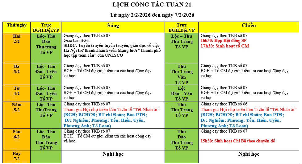 Lịch công tác Tuần 21 (từ ngày 02/02/2026 đến 07/02/2026)