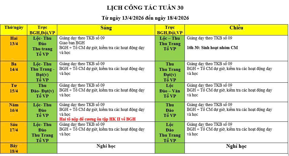 Lịch công tác Tuần 30 (từ ngày 13/04/2026 đến 18/04/2026)