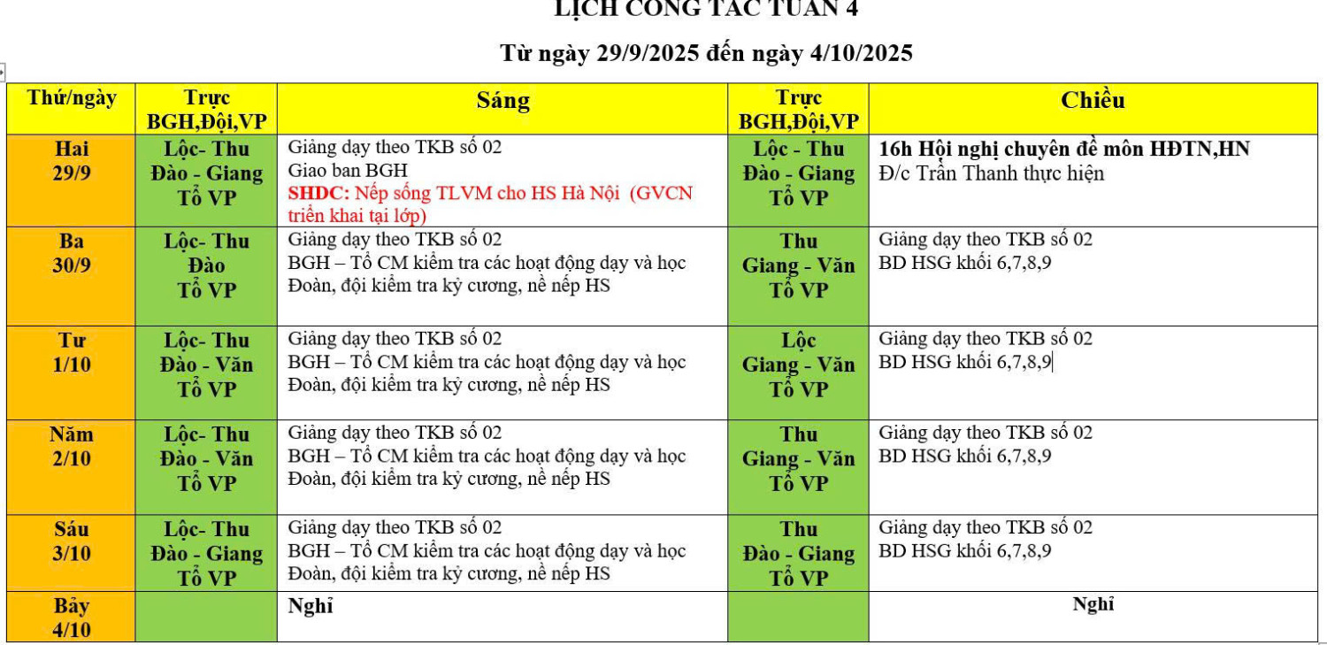 Lịch công tác Tuần 4 (từ ngày 29/9 đến 03/10/2025)