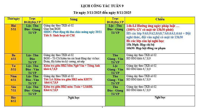 Lịch công tác Tuần 9 (từ ngày 03/11/2025 đến 08/11/2025)