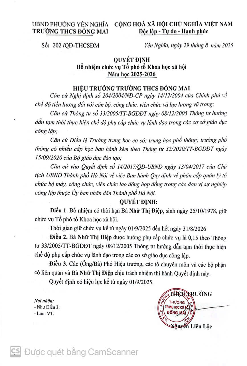 Quyết định bổ nhiệm chức vụ Tổ phó tổ KHXH Năm học 2025-2026