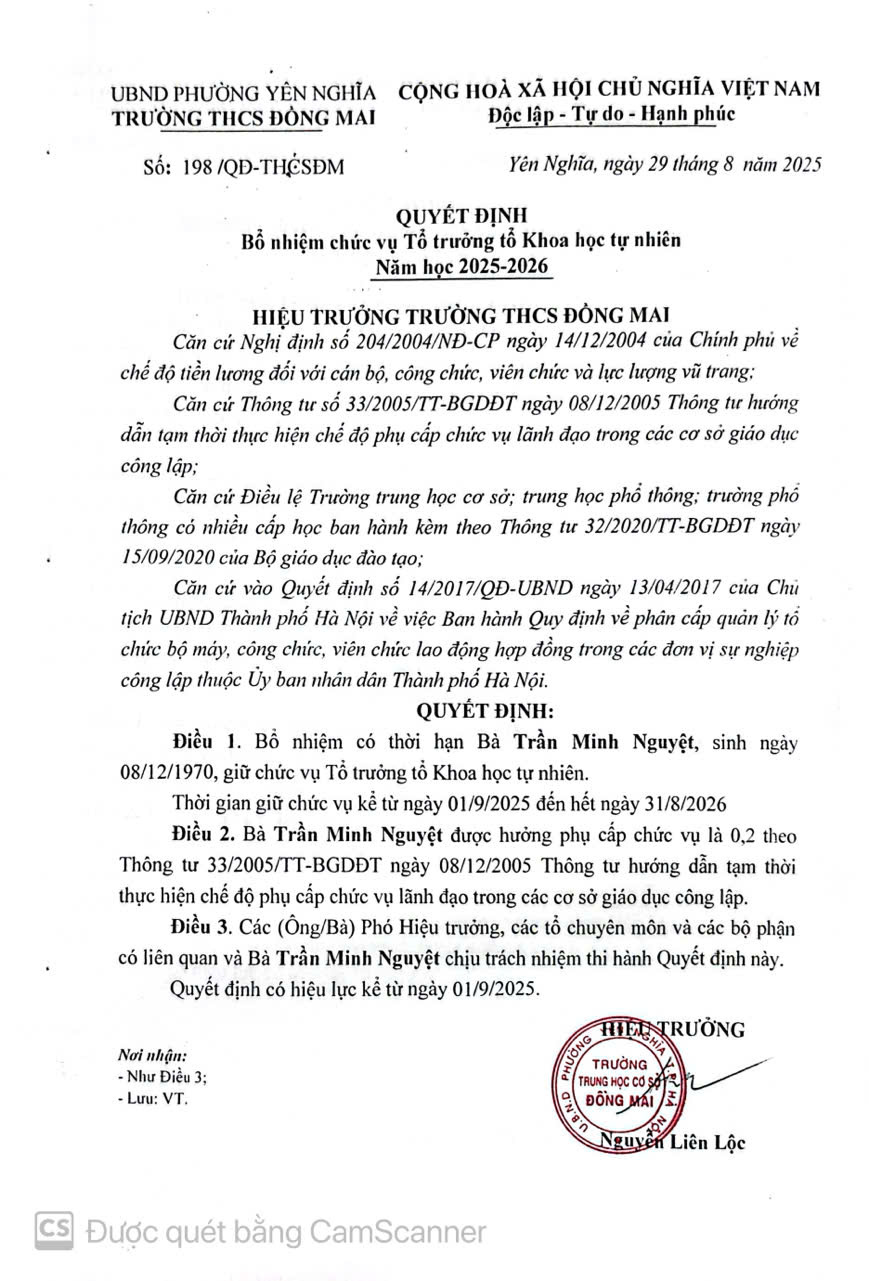 Quyết định bổ nhiệm chức vụ Tổ trưởng tổ KHTN Năm học 2025-2026