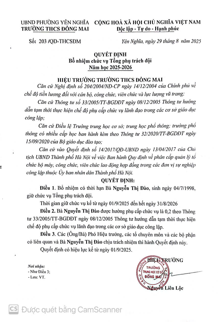 Quyết định bổ nhiệm chức vụ Tổng phụ trách đội Năm học 2025-2026